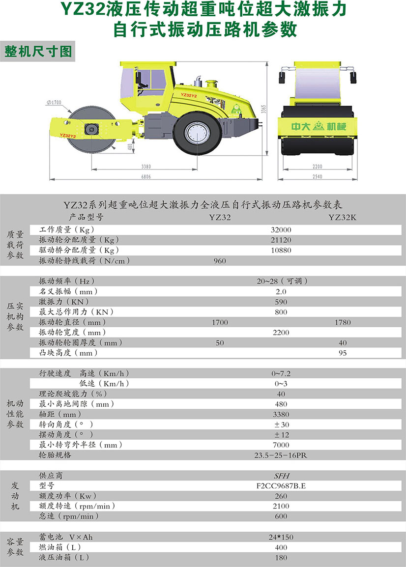 中大YZ系列超重噸位超大激振力全液壓自行式振動壓路機的主要特點: